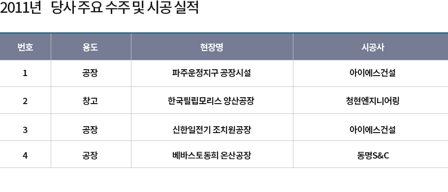 | 10 | 명화공업 증축공사 | 엠에스티 | S조 | 공 장 | 2013-06-12 |